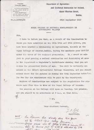 | 1912 | I secured a scholarship in agriculture, tenable for four years in the College of Science and had only the last term to do, at Easter 1916. |