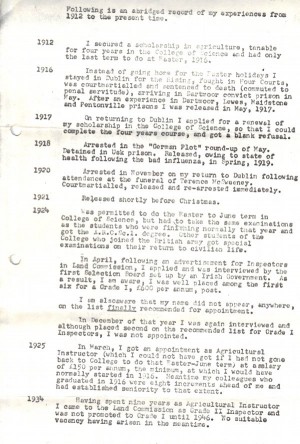 | 1934 | In March, I got an appointment as Agricultural Instructor (which I could not have got if I had not gone back to college to do that Easter-June term) at a salary of £150 per annum, the minimum, at which I would have normally started in 1916. Meanwhile my colleagues who graduated in 1916 were eight increments ahead of me and had established seniority to that extent. Having spent nine years as Agricultural Instructor I came to the Land Commission as Grade II Inspector and was not promoted to Grade 1 until1946. No suitable vacancy having arisen in the meantime. Having regard to the discrimination shown against me in 1924 in depriving me of a Grade 1 Inspector post for which I qualified at a Civil Service Board, I consider that, in equity I should have been given Grade I rank on my appointment in 1934, and that as a result of having been given only Grade II rank, I have been harshly penalised. I understand that in the somewhat analogous case of Mr. C.W. Little who was dismissed while serving as an Assistant Inspector, Mr. Little was appointed to a post of Grade 1 Inspector on his reinstatement in 1932. It can be seen I was in prison for Christmas 1916, 1918 and 1920. Periods out of prison 1916-1922 meant being almost continuously “on the run”. From a purely personal point of view it is quite evident that the nine years, three of which I spent in prison from 1916 to 1915 were a dead financial loss. I also suffered severely in being deprived of my appointment as a Grade 1 Inspector from 1924 to 1934. In my opinion I have received nothing that could be deemed reasonable compensation for that loss apart entirely from any mark of appreciation of patriotism and national service. I hold medals and certificates of service, including one for membership of the 26th Battalion Old I.R.A. during the last war. I could claim, in addition to the forgoing, consideration on compassionate grounds, but as my present position of financial embarrassment arose from the events and experiences already related I make only the following points:- Married 1922. Six in family. Eldest 29 years, married. B.E. (Mech & Elec.). Second a daughter, Shorthand-typist. Son, a commercial traveller. Son a Clerical student. Daughter just qualified as Doctor. Son a dental student in U.C.D. Three of the six will continue to be dependant on me for several years as the lady doctor will not be in a position to support herself for two years at least. University education for four was really beyond my means but I could not well refuse it. I am still endeavouring to reduce a rather big overdraft and pay interest arising from purchase of my dwelling and have mortgaged both the house and life insurance policies in that respect. In conclusion, I would ask that sympathetic consideration be given to my application to be retained in the service for a further period after the 27th of May next. |