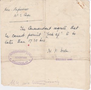 | 1920 | Arrested in November following my return to Dublin following attendance at the funeral of Terence McSweeney. Courtmartialled, released and re-arrested immediately. |