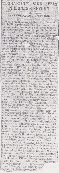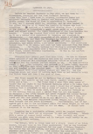 | 1916 | Instead of going home for the Easter holidays, I stayed in Dublin for the Rising, fought in Four Courts, was courtmartialled and sentenced to death (commuted to penal servitude), arriving in Dartmoor prison in May. After an experience in Dartmoor, Lewes, Maidstone and Pentonville prisons I was released in May, 1917. |