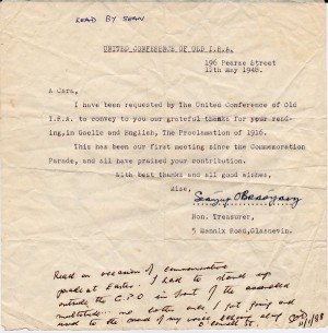 Letter to Con’s son Sean O’Donovan from United Conference of Old I.R.A.
